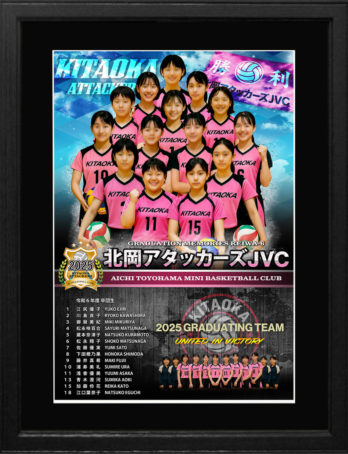 デザインパネルはレイアウトするお写真の枚数に応じて、6名までの「少人数用デザイン」と7名以上の「通常デザイン」の2種類のレイアウトパターンで作成させて頂きます。少人数用デザインは右下が個人別のデザイン、通常デザインは全員共通のデザインとなります。額装されたパネル完成品です。