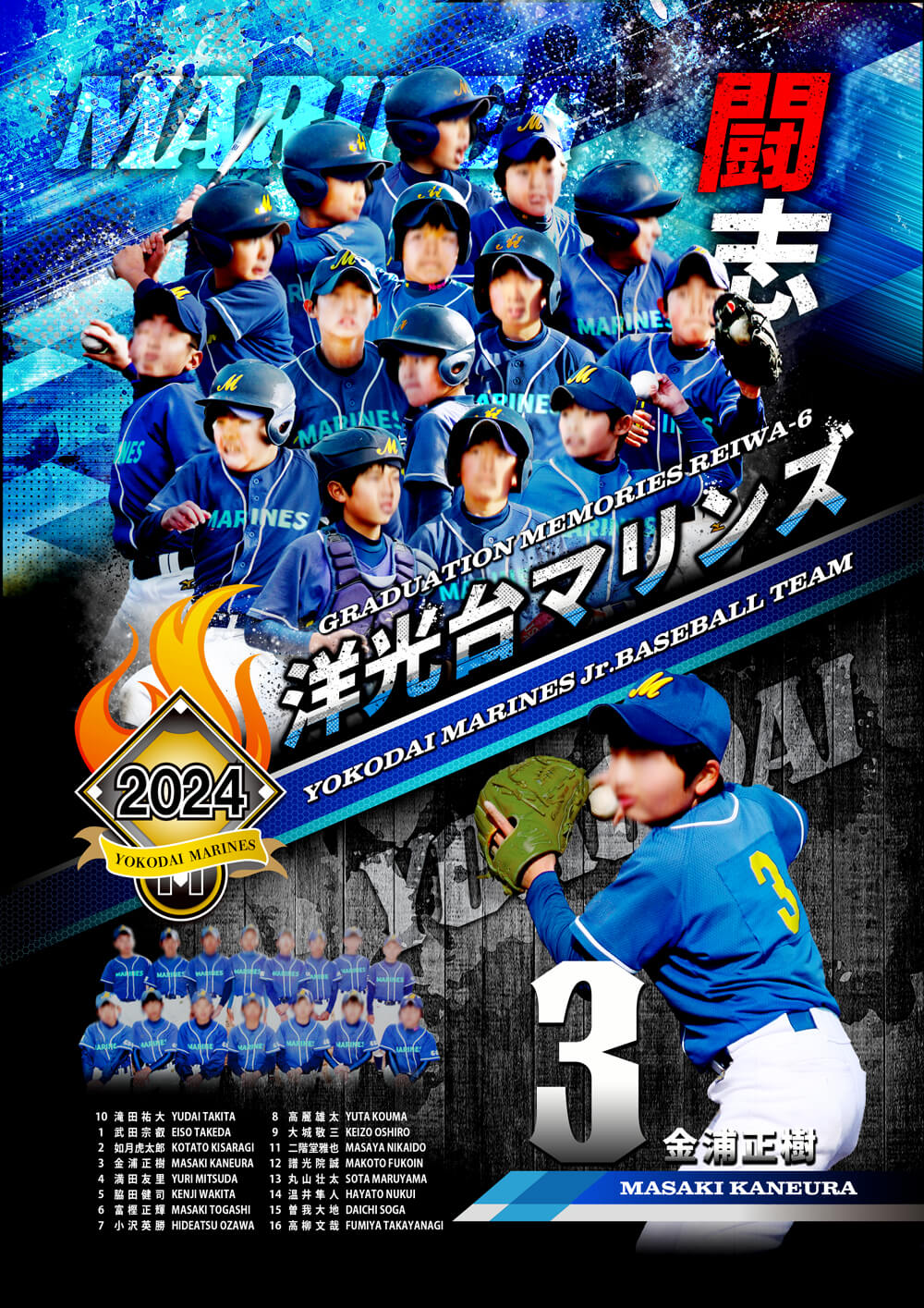 左下に集合写真と選手名の一覧、チーム名上部に各選手のお写真(2~6名まで)をレイアウトします。チーム名上部にレイアウトされた写真の枚数より、作成枚数が少ない場合のみ別途デザイン手数料が生じますが、レイアウトした全員で購入の場合は別途デザイン手数料は掛かりません。