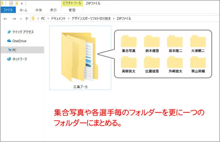 デザインパネル・デザインデーターを作成する際、各選手毎にフォルダー分けされた状態のデーターを送って頂くのが必須となりますが、ZIPファイル形式に変換すれば、画像転送サービス等で送信出来、郵送よりも手間がかからない為お勧めです。これからの説明はwindowsでの場合となりますがMacでもだいたい同じではないかと思います。