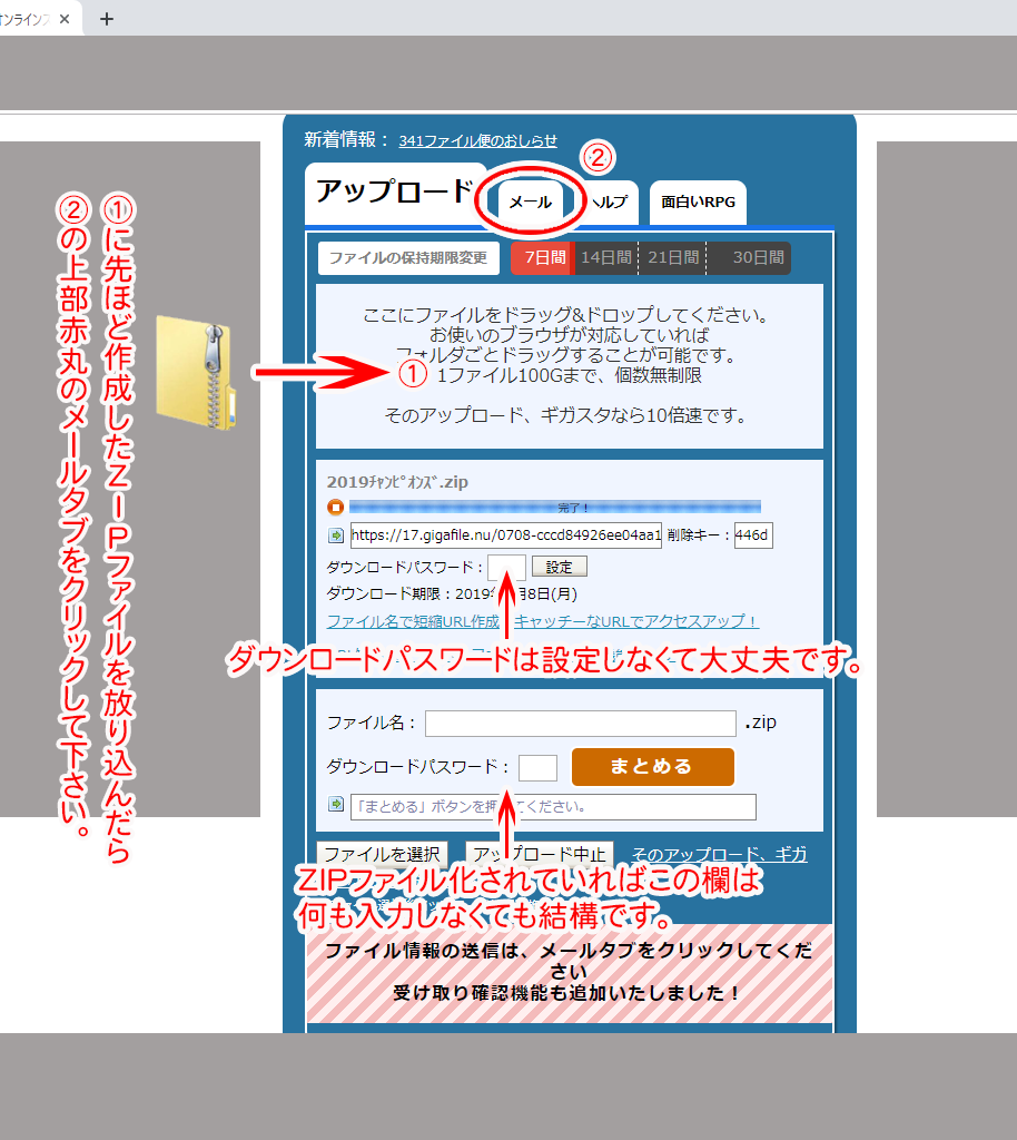 ここでは、ギガファイル便という無料の転送サービスを使ってZIPファイルを送信します。上記リンクにアクセスし、スクロールすると(少々広告が目立ちます)下図のようにファイルをアップロードする箇所があるので①の様にZIPファイルを放り込んで下さい。下部の「ファイルを選択」からでも大丈夫です。