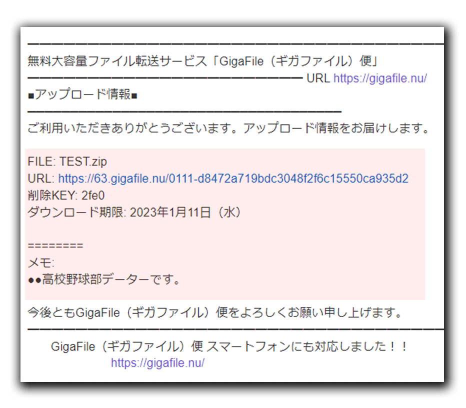 ※以前はギガファイル便から直接こちらにメールが届いていましたが、一旦お客様のアドレスにアップロード情報を送信してから、こちらに転送して頂く形に手順が変更になったようです。お手数をお掛けしますが郵送するよりかは手間も費用も掛かりませんので是非ご利用下さい。